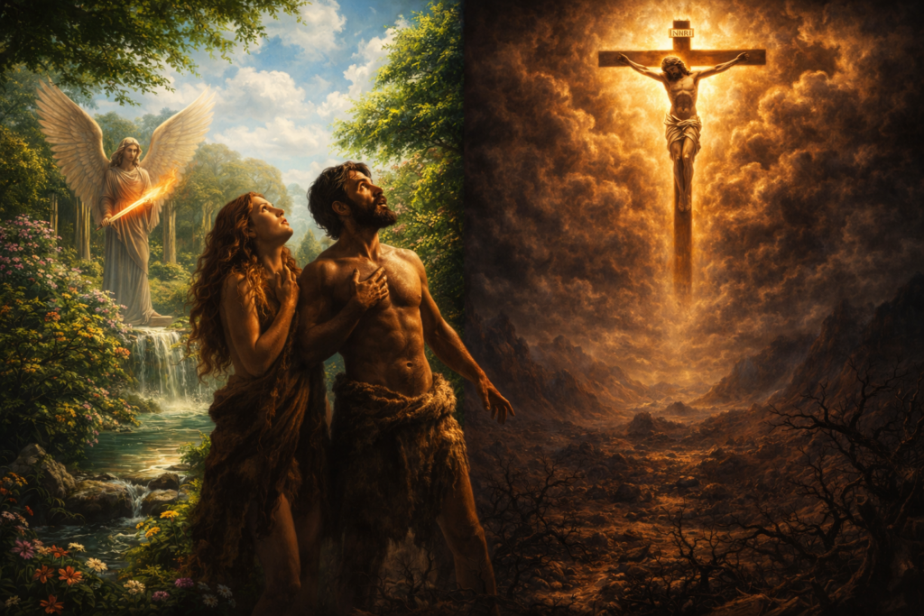 “I have read that there is a picture in one of the art galleries in Europe which depicts the expulsion of Adam and Eve from the Garden of Eden. In that picture, Eden lies just behind them and an angel with a flaming sword guards the gate against their return. Before them stretches a waste of briars and thorns. But Adam and Eve are not pictured as looking back with sorrowful longing towards Eden, nor are they looking with shrinking fear at the wilderness before them. The artist has depicted them as looking up towards heaven, awestruck, and overwhelmed with horror at what they see, for a great cross has appeared in the heavens above them, and the One Whom they had known and worshipped in the Garden of Eden, is now nailed upon that cross”